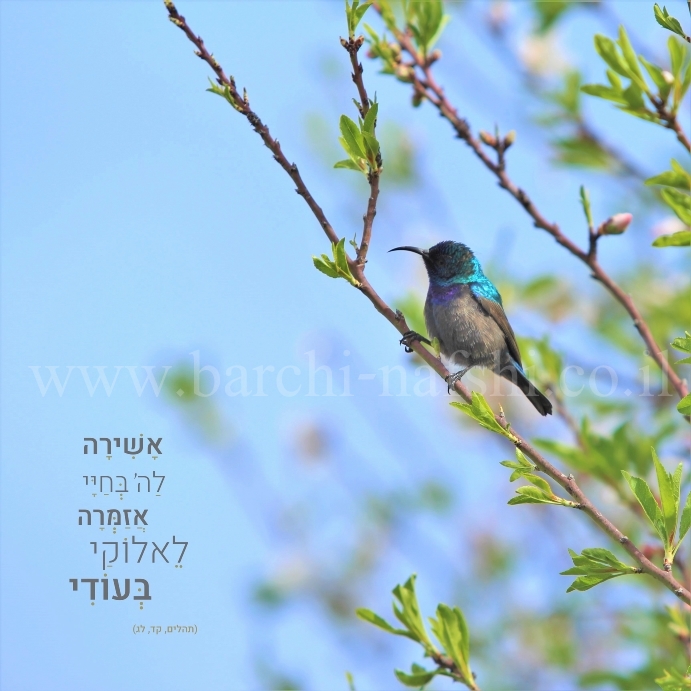 צילום אמנותי בסגנון כפרי, ציפור הצופית על ענף עץ השקד, בשילוב פסוק מפרק ברכי נפשי בתהלים "אשירה לה' בחיי, אזמרה לאלוקי בעודי"..