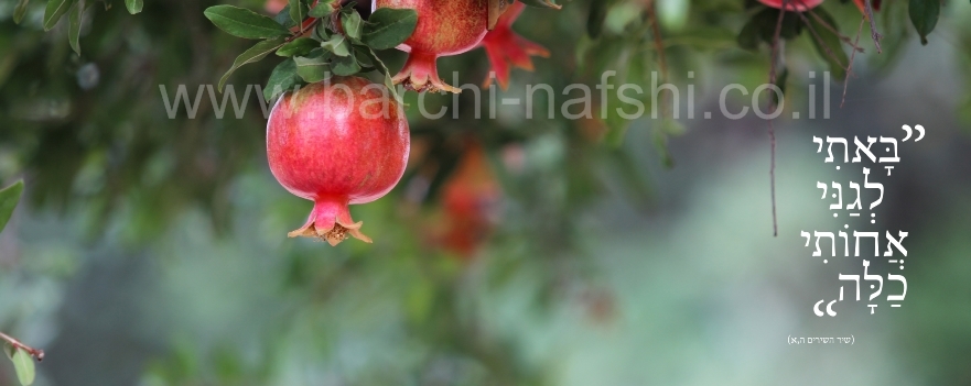 תמונה מוארכת ואמנותית שצולמה בין עצי הרימון, בשילוב מילים משיר השירים פרק ה, המשל על אהבת ה' לכנסת ישראל.