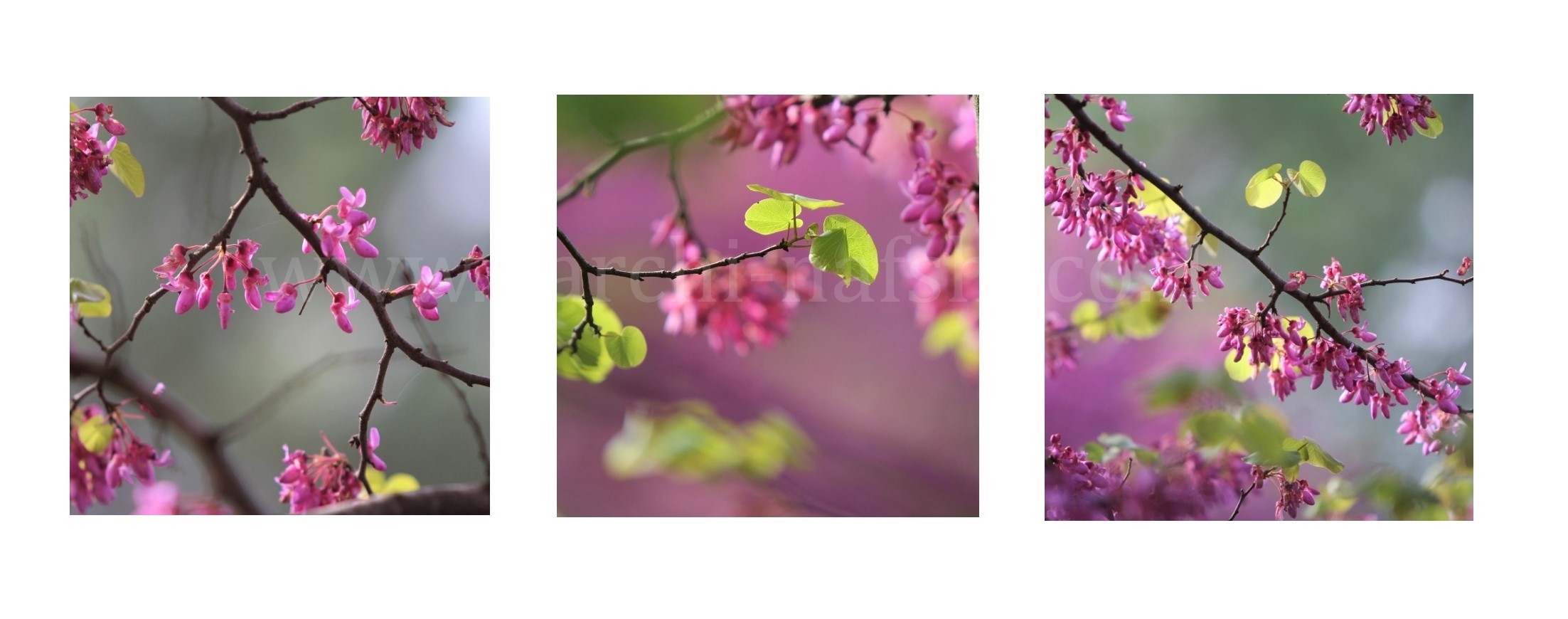 סט שלישיית תמונות של לבלוב מתחדש ומרנין בעצי כליל החורש.
