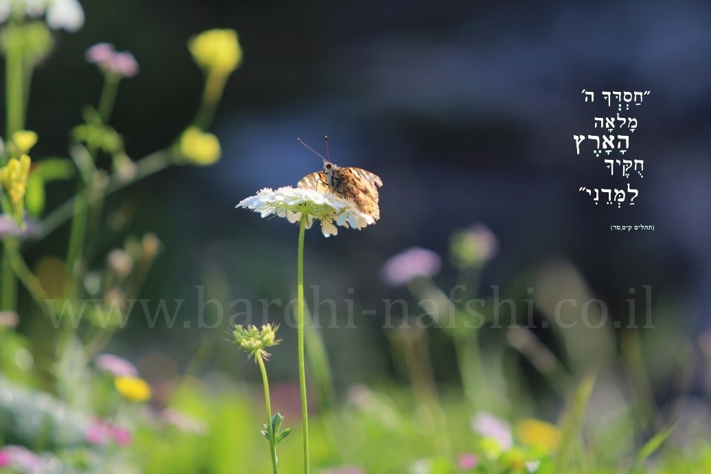 צילום טבע אמנותי של פרפר נמפית על פרח השפרירה בשילוב פסוק מתהלים קיט "חסדך ה' מלאה הארץ, חוקיך למדני".