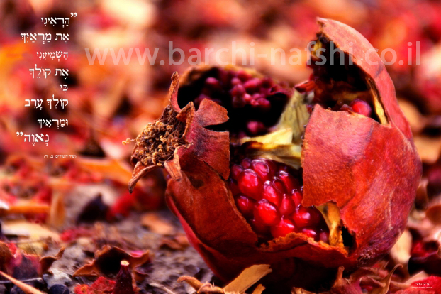 תמונה של רימון בקוע בשילוב פסוק משיר השירים, הראיני את מראיך.. איזור צילום-שפלה. פיתוח על קנבס.