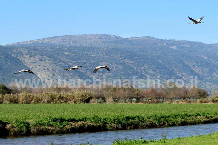 תמונה של עגורים במעוף, צולם אל מול הרי נפתלי. פיתוח על קנבס.