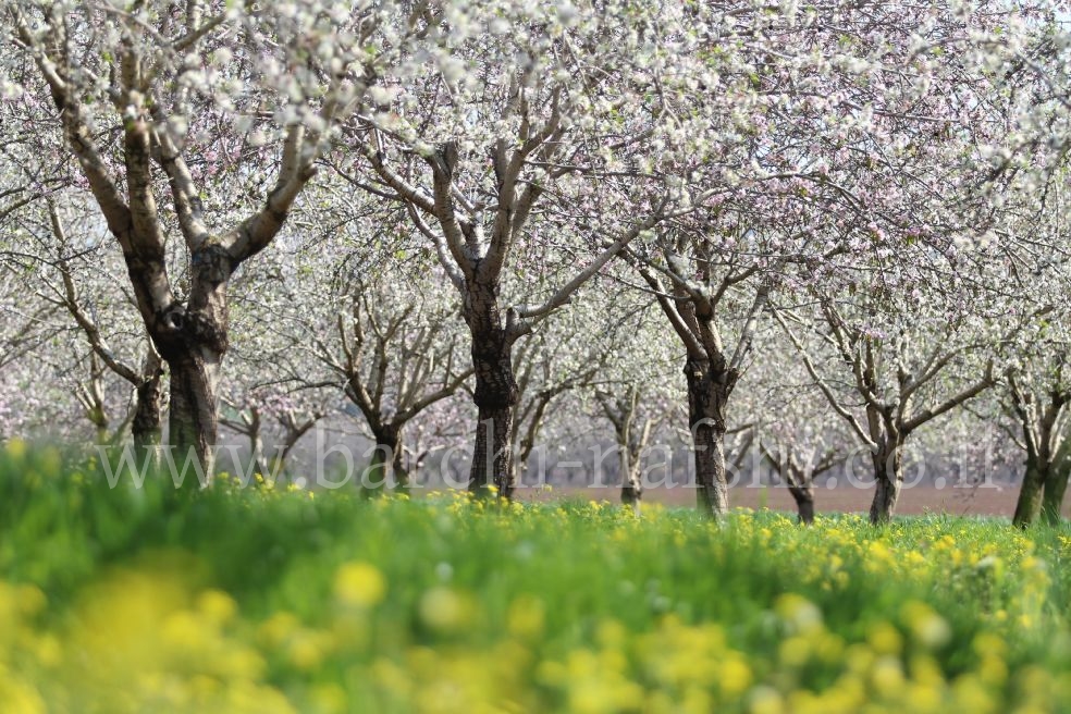 צילום אמנותי מלא בשמחה, פריחת עצי שקד מרשימה בין פריחת סביונים צהובה. אזור צילום: עמק יזרעאל.