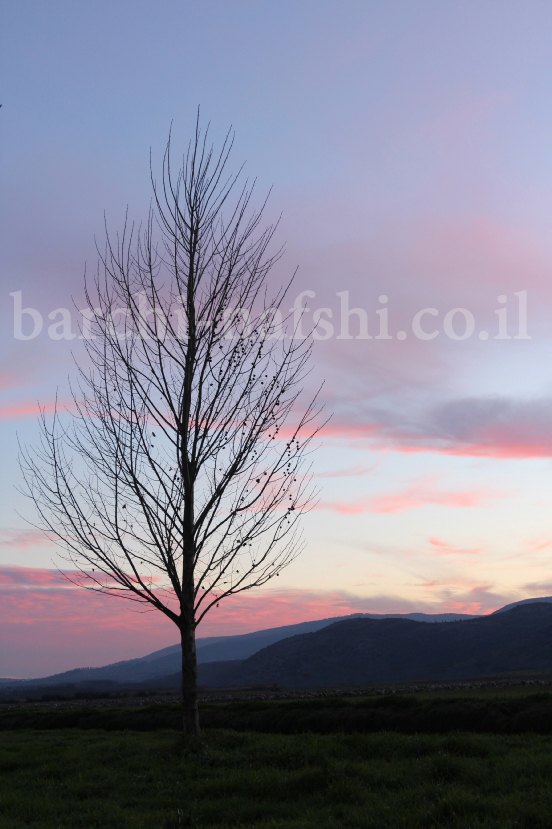 תמונה יפה ושקטה של שקיעה בעמק החולה, לצד עץ דולב בשלכת.